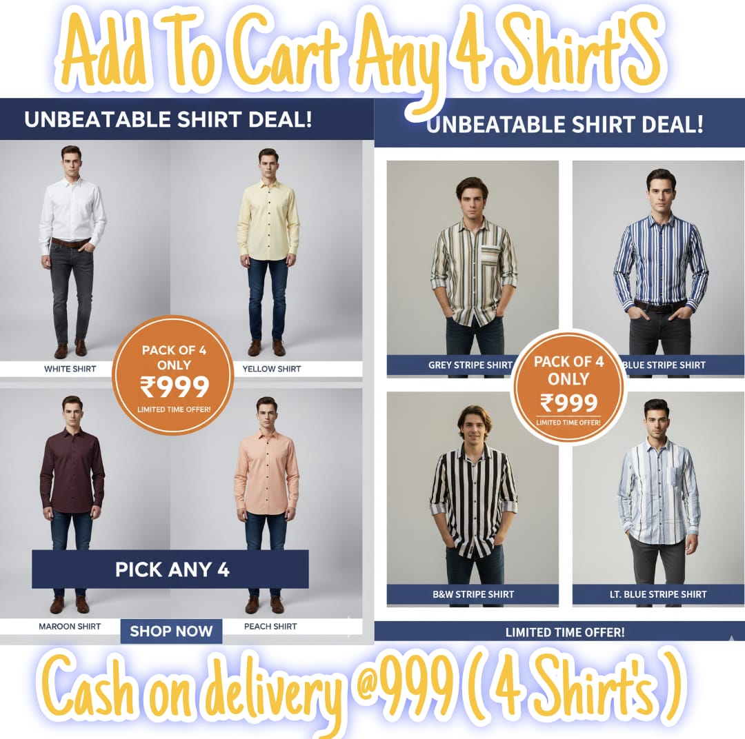 Regular price Rs. 999.00Regular priceRs. 599.00Sale price Rs. 999.00Men’s Stylish Cotton Shirts Combo Pack of 4 (White, Yellow, Maroon & Peach)